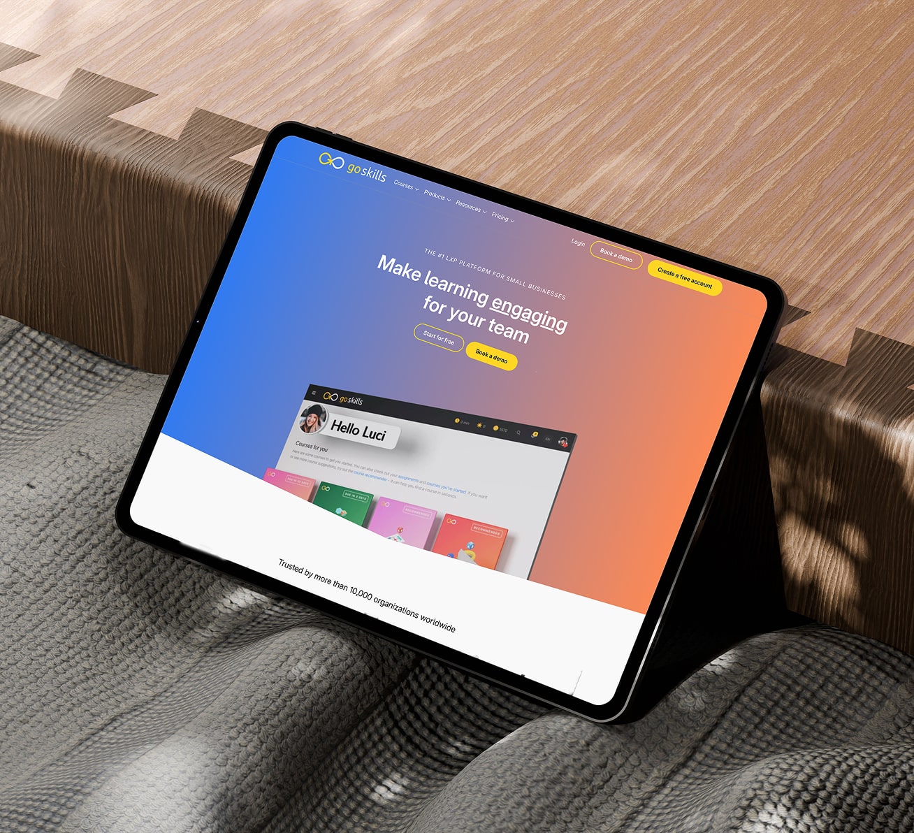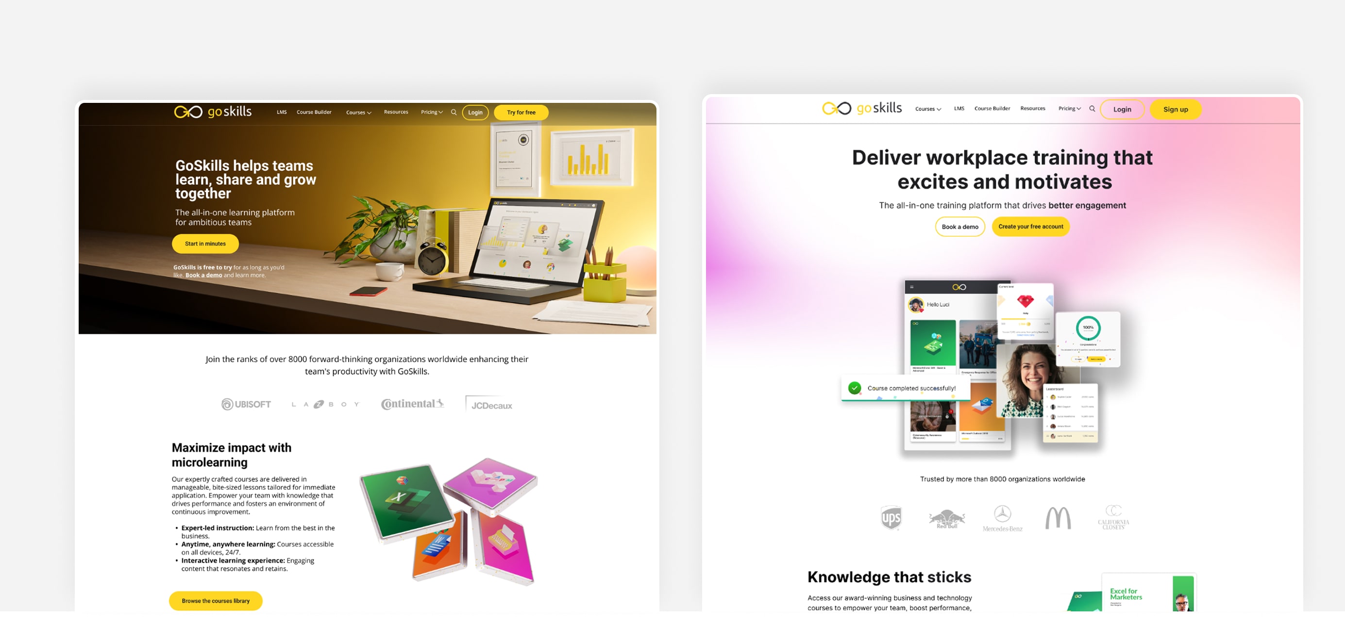 As GoSkills evolved, the story also needed to evolve, shifting from a learner-first narrative to one that spoke directly to businesses. This meant repositioning the brand from selling individual courses to selling experiences that scale skills across entire organizations. I designed more than ten new pages to lead this transformation, shaping a clear journey for companies: from discovering how GoSkills could engage their teams, to exploring tailored solutions for industries, to seeing proof through awards and success stories. The design no longer just celebrated individual learners, it showcased how GoSkills could help businesses learn, grow, and perform together.