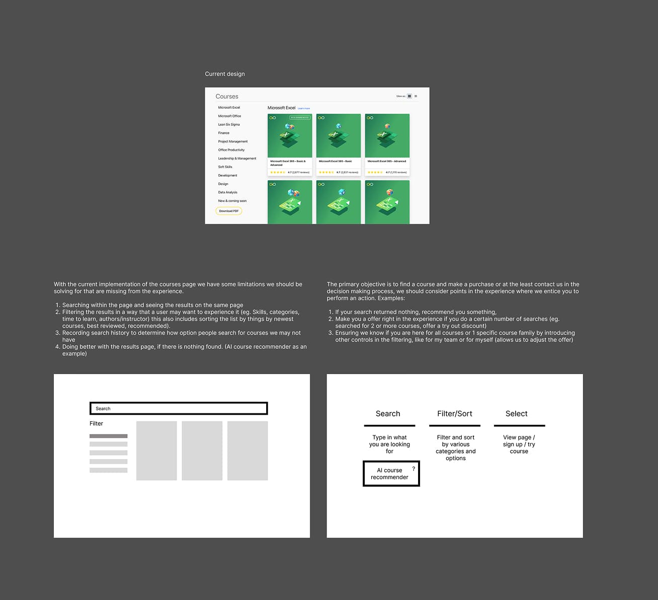 Every learner’s journey starts with a search. But at GoSkills, discovery needed to feel more than just functional, it had to feel guided. Early pitches focused on how categories, filters, and recommendations could help learners find the right course faster. Instead of dropping users into an endless catalog, the design began shaping pathways, turning exploration into the first step of learning.