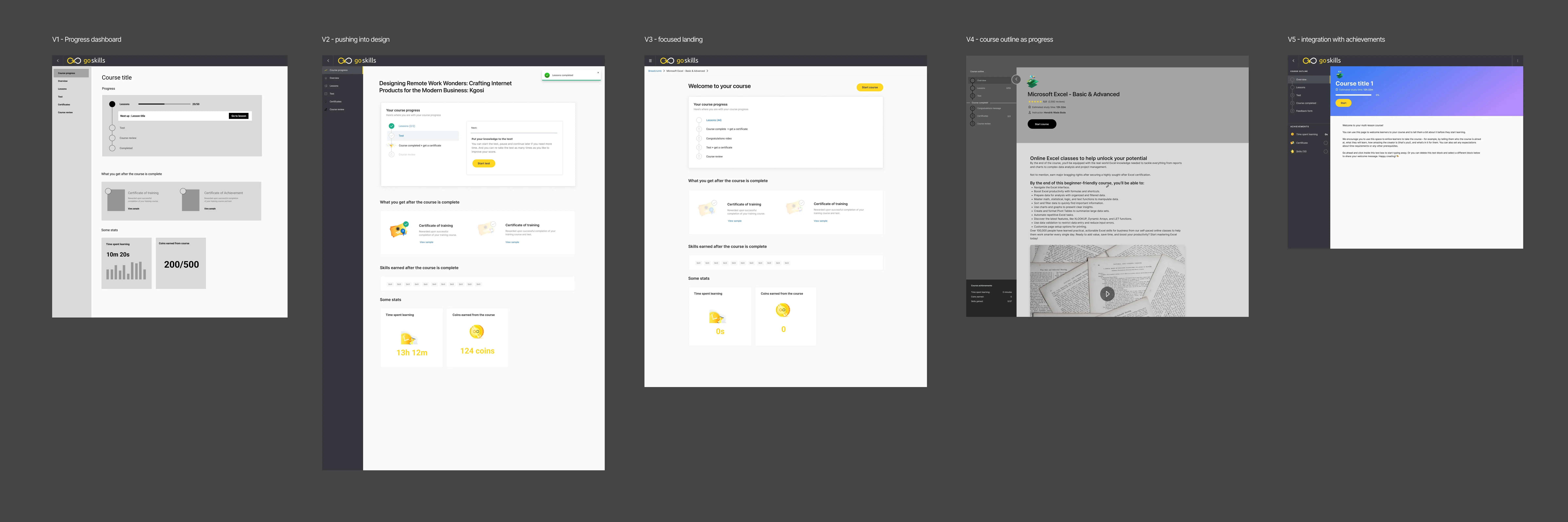 Once inside a course, the design challenge shifted. Wireframes mapped out how lessons, tests, and achievements could be structured so that learners always felt forward motion. Progress wasn’t hidden in a tab — it was woven into the flow, with every checkpoint nudging the learner toward the next step.